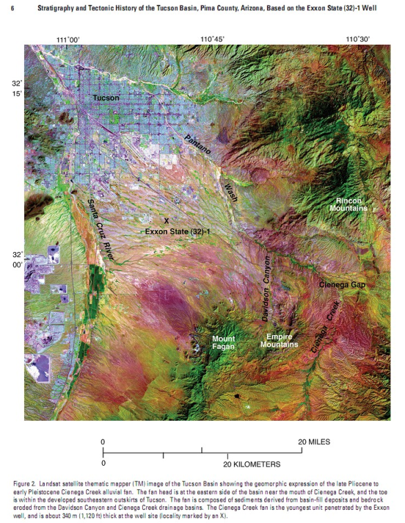 Have you ever wondered what lies beneath the pavement and neighborhoods in Tucson? We have some idea from all the water wells drilled in the Valley, but they barely scratch the surface. The deepest and most complete picture comes from a 12,556-foot deep well drilled by Exxon in 1972. Those were the days of the great “overthrust” play in oil exploration. (See an Arizona Geological Survey publication “The Great Southwestern Arizona Overthrust Oil and Gas Play.”) That Exxon well penetrated granite bedrock at a depth of 12,001 feet but never found the “overthrust.” A complete well log and interpretation can be found in USGS Scientific Investigations Report 2004-5076.