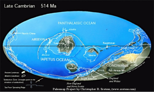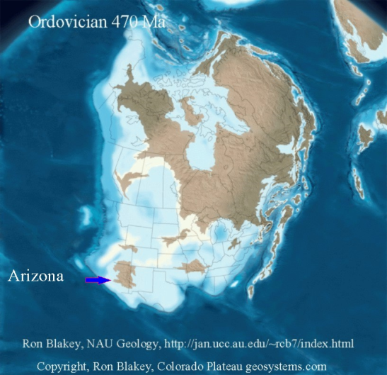 In Chapter 1, the Precambrian, Arizona was at the South Pole and had just emerged from the sea. Plate tectonic movement was carrying what would be North America northward, and by Cambrian time (542- to 488 million years ago), North America spanned the equator. But the orientation was 90 degrees clockwise from its current setting so that the equator ran from Mexico through Canada.