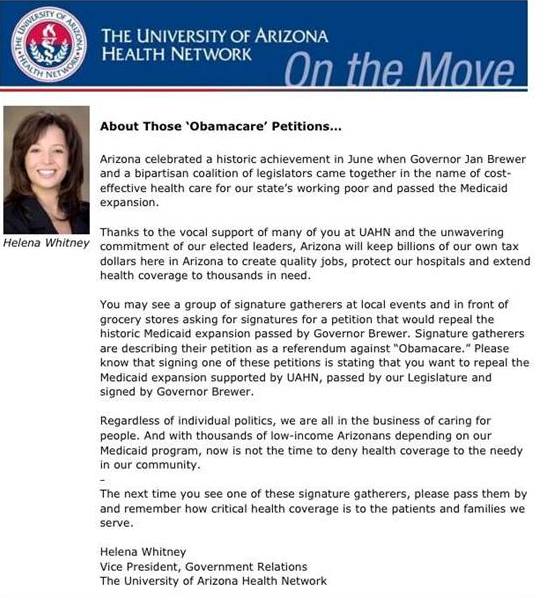 Employees of the University of Arizona Health Network were surprised on Wednesday, August 28, when they received an email from Helena Whitney, Vice President of Government Relations. The email included an order on their behavior with regards to petitions for the People’s Veto of Governor Brewer’s Medicaid Expansion program.