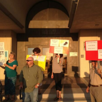 Protesters gathered in front of district offices calling for the resignation of board member Bobby Garcia. It is widely believed that Garcia is behind the creation and delivery of fliers attacking Hernandez. (See article here.)