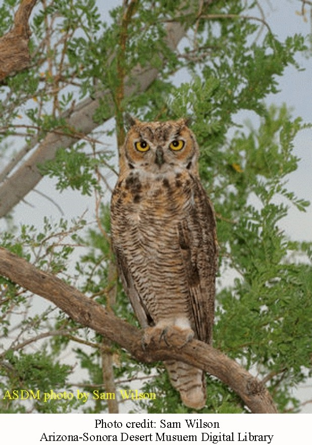 Great Horned Owls inhabit my neighborhood, but I rarely see them because we keep different hours, and they are masters of camouflage (see photo at the end of this article). However, I often hear them early in the morning just before sunrise. They have a distinctive sound – a loud, penetrating “hoo hoo”, similar in cadence to, but deeper than a Mourning Dove. They are the only owls that actually go “hoo-hoo.” Listen to their sounds at the Cornell Lab of Ornithology here  (Scroll down and click the “sound” tab). See 84 photos at the Arizona-Sonoran Desert Museum digital library here.