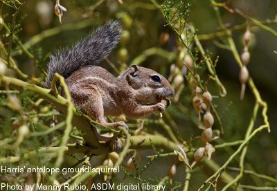 The Harris’ antelope ground squirrel (Ammospermophilus harrisii) resembles a chipmunk, but it has a white stripe on its side that chipmunks lack (but chipmunks have white stripes on their faces). Also, chipmunks live at higher elevation, not on the desert floor. This squirrel seems to prefer rocky areas. The Harris’ antelope squirrel usually feeds on cactus fruit, seeds, and mesquite beans, but it will take insects and mice. They will climb a barrel cactus to get the fruit in spite of the spines. The Harris’ antelope squirrel is active all year. During hot days, it uses its busy tail to provide some shade. They dig burrows about three feet deep where conditions allow.