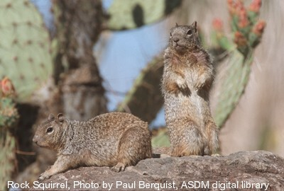 Upon encountering a snake, a rock squirrel will stamp its feet and wave its tail from side to side while facing the snake. It also tries to flick sand or dirt in the snake’s face with its front paws. This behavior is called mobbing. Researchers in California note that rock squirrels can distinguish between venomous and non-venomous snakes, and change their mobbing behavior accordingly. Apparently, adult rock squirrels can at least partially neutralize rattlesnake venom. Rattlesnakes have heat-sensing organs which can detect a difference in temperature as little as 0.01 F at one foot. There is some research that suggests that rock squirrels take advantage of this. The squirrel can pump extra blood into its tail to make the tail warmer than its body, thereby fooling the snake into striking at the tail rather than the body.