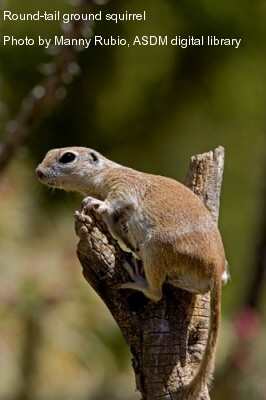 The round-tailed ground squirrel (Spermophilus tereticaudus) resembles a miniature prairie dog, and like them, is a very social animal that lives in small colonies. It is usually grey to beige with a long, black-tipped tail. Adults weigh 6- to 7 ounces. They inhabit valleys and alluvial fans. The round-tails are primarily herbivores, feeding on grass seed, cactus, and other nearby vegetation such as spring flowers, but they will eat carrion. They may sleep for a few weeks in summer until the monsoon arrives. The round-tailed ground squirrel hibernates in the winter. The round-tails are champion small miners. They may have an extensive tunnel network with multiple entrances. They, too, breed in early spring with pups born in March or April. The pups usually emerge with their mother by May.