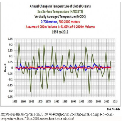 To begin analysis of the mystery, I present a graph of ocean temperatures prepared by Bob Tisdale, proprietor of Climate Observations, and a specialist in matters of ocean temperature and heat content, as well as the El Nino oscillations that drive our weather. According to this graph, there has not been much change in global ocean temperature since 1955 when the graph starts.