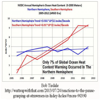 The graph above shows a rough average of global ocean heat content. No apparent missing heat there, but individual ocean basins and hemispheres show a more complicated story.