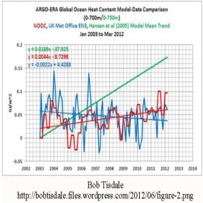 Just where the heat is and how much there is seems to depend on who is doing the modeling. The U.S. National Oceanographic Data Center ARGO data shows a slight rise in global ocean heat content, while the British Met Office, presumably using the same data shows a slight decline in global ocean heat content.