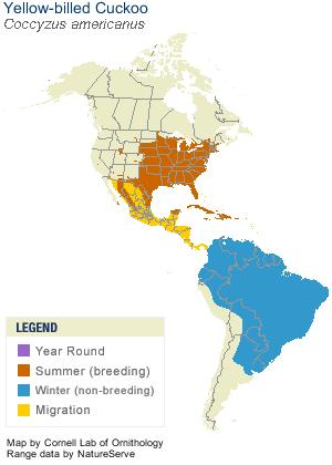 Arizona and other western states are at the fringe of the cuckoo’s range. The Yellow-billed Cuckoo is common in the southeastern U.S. See the range map from the Cornell Lab of Ornithology below: