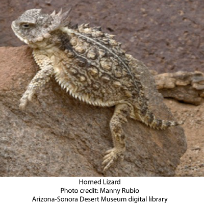 Horned lizards range from southern Canada, through the western U.S., Mexico, and Guatemala. There are 16 or 17 species (depending who is counting). Seven species occur in Arizona. The most common near Tucson is the Regal horned lizard, and the largest is, of course, the Texas horned lizard. The regal horned lizard has a crown of ten horns, four large occipital horns and six smaller horns on each side. Horns on the head are part of the skull, whereas, body horns are specialized scales. These lizards are harmless to humans.
