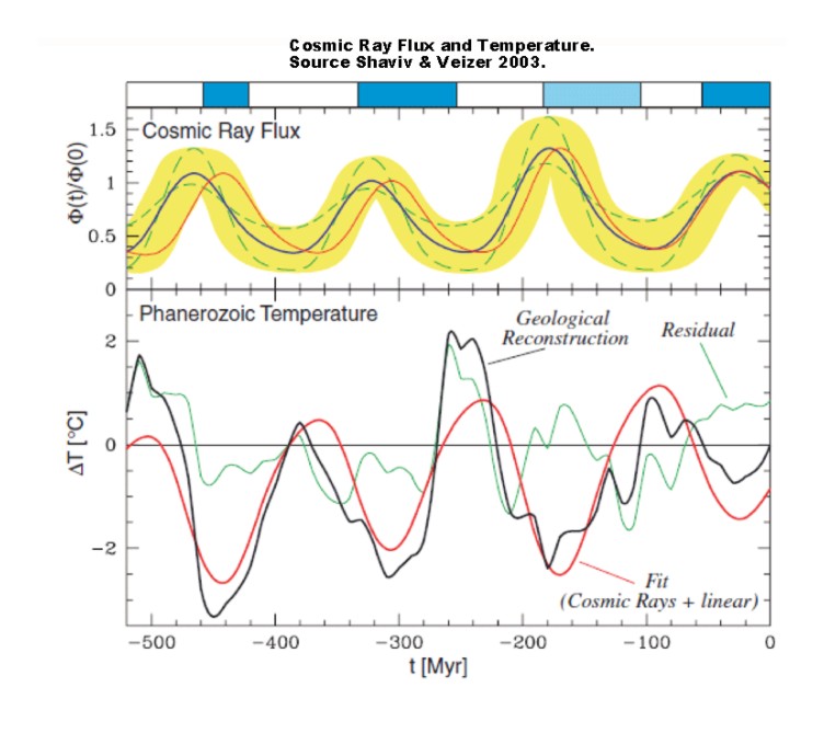 In the graph below, the top panel shows several calculated cosmic ray flux reconstructions. In the bottom panel, that curve (red) is flipped to represent the cooling effect. Notice that the cosmic ray flux coincides with the geologic reconstruction (black) of ice ages. (The green “residual” curve represents the mathematical variance between models and observations.)
