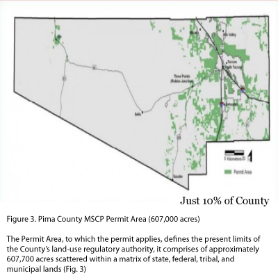 The plan could have been relatively simple and deal with only those endangered species likely to be affected by growth in the County. If it had done that, the plan could be in place now. However, Pima County had loftier ideas: “The biological goal of the Sonoran Desert Conservation Plan is to ensure the long-term survival of the full spectrum of plants and animals that are indigenous to Pima County through maintaining or improving the habitat conditions and ecosystem functions necessary for their survival.”