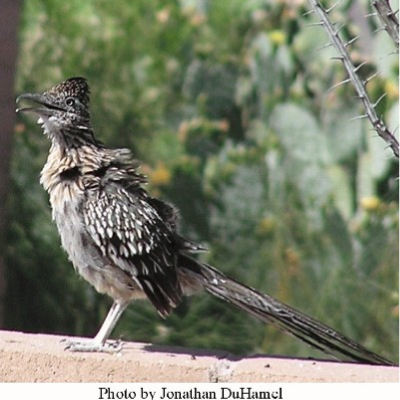 The greater roadrunner is our largest cuckoo with a body length of 20-24 inches and a wingspan of 17-22 inches. It avoids flying and prefers to run at speeds up to about 15 mph. Even just standing on the ground, it is fast enough to snatch a hummingbird out of the air.