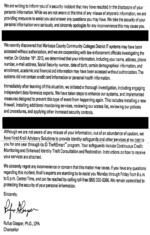 maricopa-communityThis week, 2.4 million current and former students and employees of the Maricopa County Community College District received notices that their personal information might have been exposed as a result of a hack into the District’s computer system.