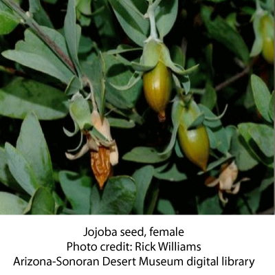 Jojoba is the second most economically valuable native plant of the desert (after Washington palms). The reason is that jojoba seeds contain about 50% ‘oil” which is actually a liquid wax. Because it is a wax rather than an oil, it does not get rancid.