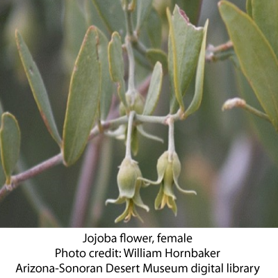Jojoba, (pronounced ho-ho-bah), Simmondsia chinensis, is an evergreen desert shrub that is usually about five feet high and wide, but can grow up to 10 feet tall. There are male and female plants usually with the ratio of four males to every female in Arizona. Only the female plant bears “fruit.” The leaves of both male and female plants are grayish-green, usually just over one inch long and usually stand vertical to the ground.