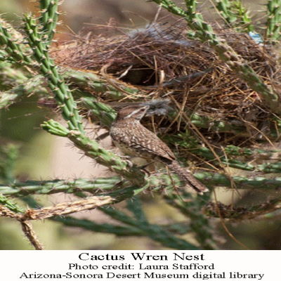 Cactus Wrens form permanent pairs and defend their territory, sometimes even by destroying nests of other birds. They nest from March through September and may have several nests going at once. Initially, both male and female build a nest, which is approximately the size and shape of a football and has a side entrance. They use dry grasses and twigs. This construction provides shade during the hot summers and shelter from cold and rain. The first nest, which may take up to 6 days to build, is lined with feathers and grass to make it soft. The female will lay 3- to 5 eggs and incubate them for about 15 days before they hatch. Meanwhile, the male builds another nest nearby as a roosting nest or retreat so the parents don’t have to sleep with noisy chicks. The male can build this second next in as little as one day. The chicks fledge after about 21 days. This sequence may be repeated; roosting nests become breeding nests for the next clutch of eggs. The male helps the female care for the chicks between his construction projects. They often recycle material from old nests to build new ones.