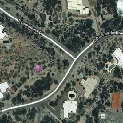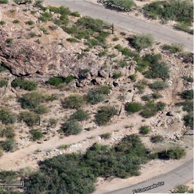 If this is in fact the location, it is now covered with a house. I drove out to the area to look around. While Ryan puts the mine just south of East Coronado Drive, I think at least part of the mine may have been just across the street to the north in the triangle formed by La Paloma and Coronado. The next graphic shows a closer look at the corner, followed by a detailed photo of a disturbed area in the triangle.