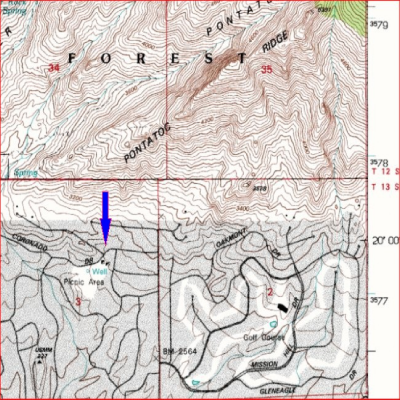 The detailed picture shows a cliff that may be a scarp of the fault in which the mineralized breccia developed. Although the ground is disturbed, there is no trace of the pit or shafts, presumably they have been filled in. It is interesting, though, that this particular lot has not been developed. This fault is apparently inactive, so homeowners shouldn’t worry.