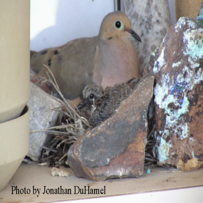 Mourning doves are monogamous and mate from February through October. They may raise up to seven broods during that time. The female builds the nest while the male provides construction material. The nests are usually rather flimsy and are built almost anywhere. The female generally lays two eggs and both male and female sit on the nest. Daddy does the day shift; the female takes the night shift.