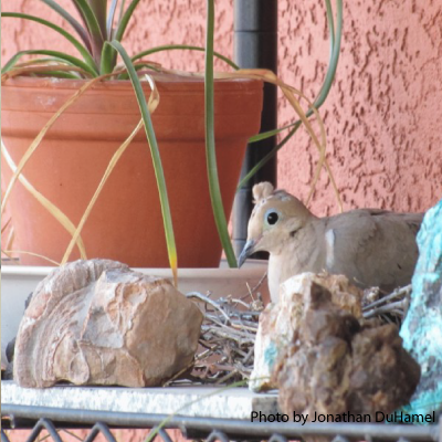 Mourning doves are the most common and widely occurring game bird in Arizona. Their range extends throughout the U.S., southern Canada, and south through Central America. And many of them like to nest on my back porch.