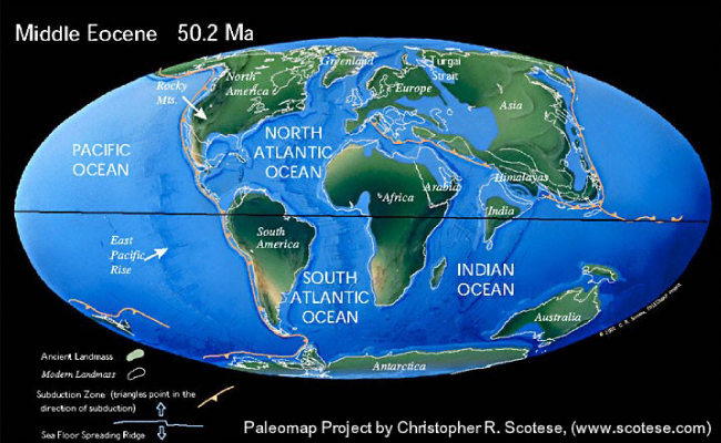 Sara Stein describes the Eocene ( in The Evolution Book): “The world that all the little brown furry things inherited from the dinosaurs was paradise. The climate was so mild that redwoods, unable now to live much further north than California’s pleasant coast, grew in Alaska, Greenland, Sweden, and Siberia. There was no ice in the Arctic. Palm trees grew as far north as 50 degrees latitude, roughly the boundary between the United States and Canada. Below that subtropical zone—that was similar to Florida’s landscape today—was a broad band of tropical rain forest.”