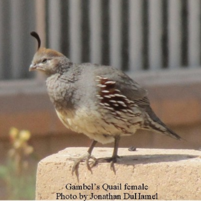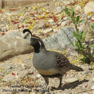 Gambel’s quail (Callipepla gambelii) are distinguished by the prominent black top-knot feathers; both males and females sport them. Their body length is about 11 inches, and wingspan is 14 to 16 inches. These quail are the most arid-adapted of all the quails. Their principal range is Southern Arizona and Southern New Mexico. In summer, they are most active in early morning and late afternoon. They seek shade and rest during the hot afternoons. They roost in bushes and low dense trees.