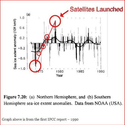 This inconvenient fact was not mentioned in the AP/Star story and it was apparently ignored by the researchers. Another thing not mentioned is that 1979, when the major satellites were launched, happened to be a time when Arctic sea ice was at a maximum. Had the study begun in 1975, the picture would be much different because then, according to the IPCC, Arctic sea ice extent was even lower than it has been since. See graph below.