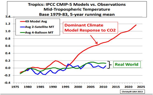 The Borenstein story contains the ominous sounding phrase: “… the entire Earth is absorbing more heat than expected…” Phrases such as that seem to be required in global warming alarmist stories. It’s always “more than expected” or “unprecedented.” What we should really be concerned about is that the projections of global temperature by climate scientists’ models are so wrong – because input assumptions are wrong, yet political policy is based on their erroneous assumptions. As Dr. Roy Spencer puts it, rather tongue-in-cheek, “95% of Climate Models Agree: The Observations Must be Wrong.”
