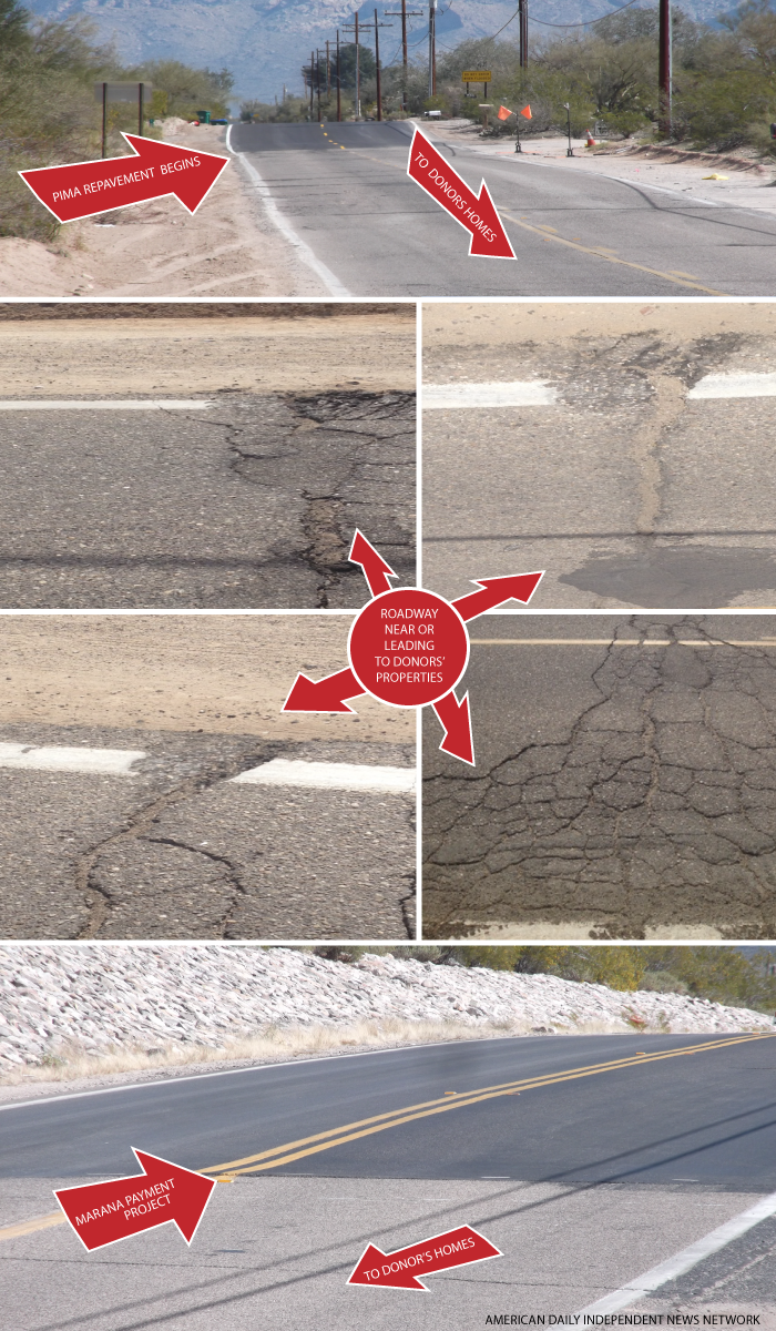 Editor’s note: According to sources, the property in question was recently annexed by the Town of Marana, which might explain why the road repair was not completed in front of the donors’ properties. There is no explanation forthcoming as to why the crack reporter failed to visit the scene before making the claim that Miller’s supporters somehow benefitted from their donations. In light of the concentrated targeting on Miller and her supporters, there is little wonder why her neighbors might have thought that they had been targeted by the County.