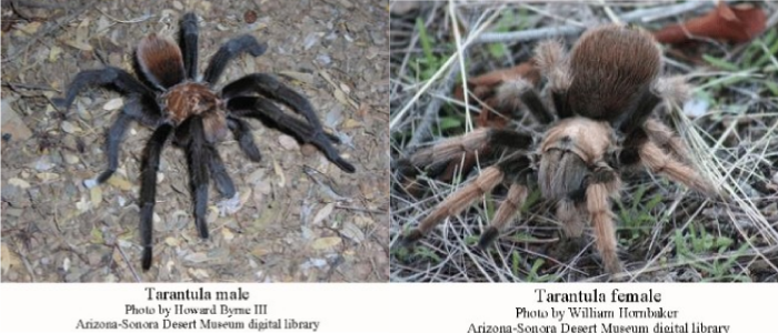 Tarantulas are primitive spiders that evolved almost 350 million years ago and have changed little since. The female Desert Tarantula is usually tan or brownish, while the male is darker, usually with black or dark legs and a reddish abdomen. Females have a large abdomen, bigger than the cephalothorax(upper body), while the males have a small abdomen. The hairs help the spider sense vibrations, which could indicate a predator or prey.