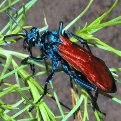 And now for a gruesome tale. The Pepsis wasp, Pepsis formosa, is a large (up to 2 inches), bluish-black wasp with orange wings. It is also know as the tarantula hawk. It is a parasite on tarantulas and uses the spiders in its reproductive cycle.