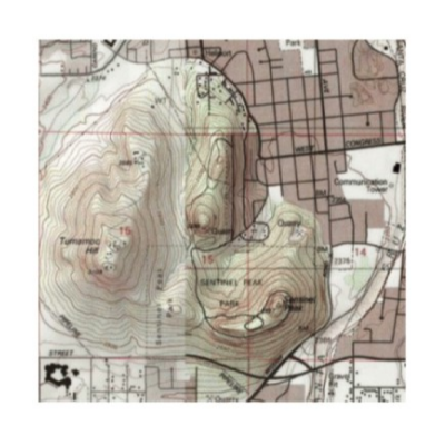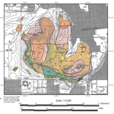 The older volcanic series (blue and green) is exposed only on the south flank of the hills along 22nd Street:
