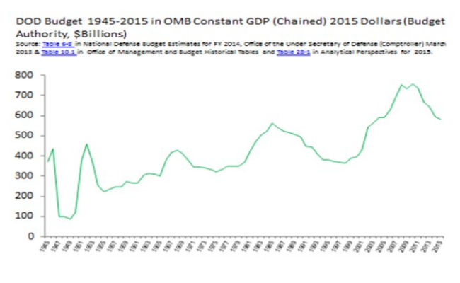 This graph tells us that the 2015 level of Pentagon spending would return us to the same overall level as 2005 when Donald Rumsfeld was secretary of defense and the DOD budget was generally considered flush with money and supporting substantial fighting in both the Iraq and Afghanistan wars. Note also that this is a level of spending that matches the peak of the Ronald Reagan years that was thought by its advocates to be a US build up so massive it was intimidating the Soviet Union into collapse. The 2015 level is also an amount that significantly exceeds the peaks of the Korea and Vietnam wars-both of them higher intensity conflicts with hundreds of thousands more US troops deployed than are currently in Afghanistan.