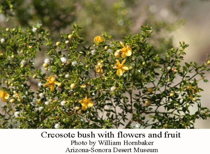 There is a legend that creosotes inhibit growth of any other plants around them. Not exactly. The roots will excrete a substance which inhibits growth of bursage, its main competitor, and it will also inhibit germination of its own seeds so competing new creosote bushes will not grow nearby. But, the creosote is an important nurse plant for small cacti and many other plants.