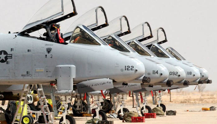 A-10 Thunderbolt IIs ares lined up on the flightline of Tallil Air Base in southern Iraq awaiting pilots. The aircraft are part of the 442nd Fighter Wing from Whiteman Air Force Base, Mo., which was deployed to Talli and Kirkuk Air Bases in 2003. (U.S. Air Force photo by Master Sgt. Terry L. Blevins)