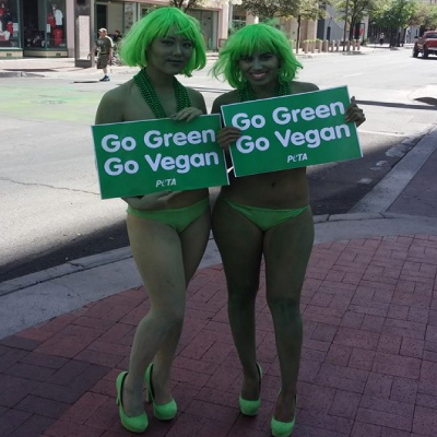 Last Friday, PETA had 2 naked women painted green at the corner of Stone and Pennington downtown to promote awareness. They had other PETA members passing out literature and held signs saying “Go Green” on them.