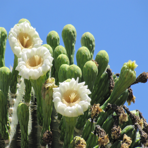 Flowers occur near the top of the main stem and on the tips of arms. The white flowers are about 3 inches in diameter and smell like ripe melon. Each flower opens at night and remains open until mid-afternoon the next day. Nectar produced at night attracts bats. A second batch of nectar is produced in the morning to attract birds and insects. Bats and white-winged doves are the main pollinators. Doves, Gila Woodpeckers, Cactus Wrens, and House finches eat the fruit and disperse the seeds.