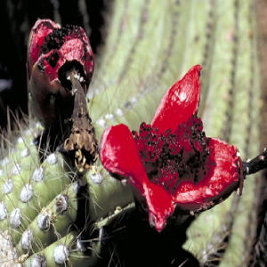 After the flowers are pollinated and fruits mature, the fruit opens to expose its red interior leading some people to think there are red flowers atop the saguaro.