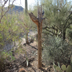 Many large saguaros contain holes excavated by Gila Woodpeckers and Gilded Flickers. The birds go in and down, removing the fleshy part of the cactus. The cactus produces scar tissue which quickly becomes very hard and impervious to bacterial infection. This material, often in the rough shape of a boot, survives after the cactus dies and rots away. Woodpeckers generally excavate a new hole each year, leaving the old hole for other cavity-nesting birds. Cactus spines deter animals from climbing the cactus. Apparently, however, they don’t deter snakes. I’ve seen photos of a gopher snake climbing a saguaro to prey on the dwellers in a hole.