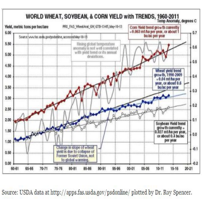 In effect the IPCC claims that climate change has already decreased yield of wheat, corn, and soybeans. Let’s look at the real data.world-wheat-and-soybean
