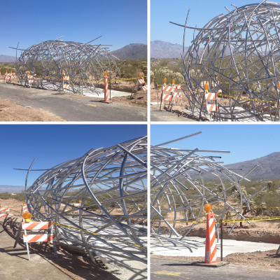 However, it provides little comfort or protection. While the sculpture is designed to be a destination/meeting place on the walking path along Houghton Road, the weave of metal pipes provide no real shelter from the sun or other elements. The sculpture was created off-site and was transported to Houghton Road for installation.
