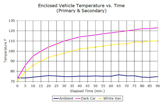 The graph above shows results when the outside temperature was about 75 F. The greenhouse heating effect becomes dangerous much more quickly when the outside temperature is warmer. If, for instance, the outside temperature is 91 F, the inside can get to 117 F within 10 minutes.