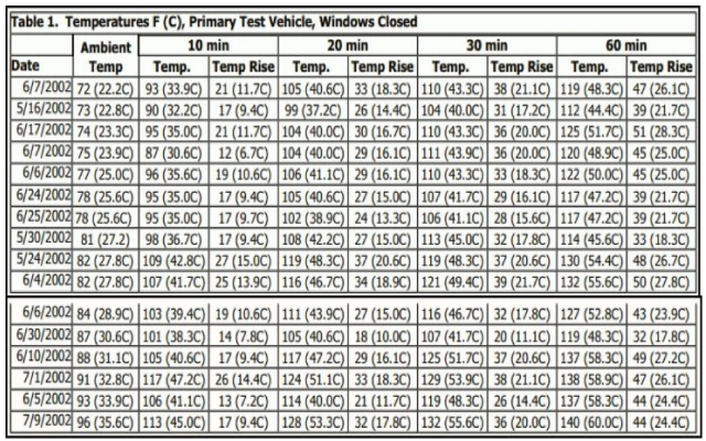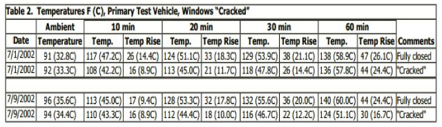 Table 2 compares temperatures versus time in closed vehicles and vehicles with windows open 1.5 inches. The vehicles with open windows don’t get quite as hot but still get dangerously warm.