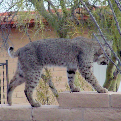 Tucson suburbs often have abundant wildlife including javelinas and coyotes, the occasional black bear and mountain lion. A bobcat (Felis rufus or Lynx rufus) frequently visits my yard in search of a meal, usually doves and quail. I have encountered it in the early morning when I go out for the paper. It usually growls at me then hides behind a bush. At other times, the bobcat ignores me because it is very focused on its prey. It is very skilled at picking birds off the wall.
