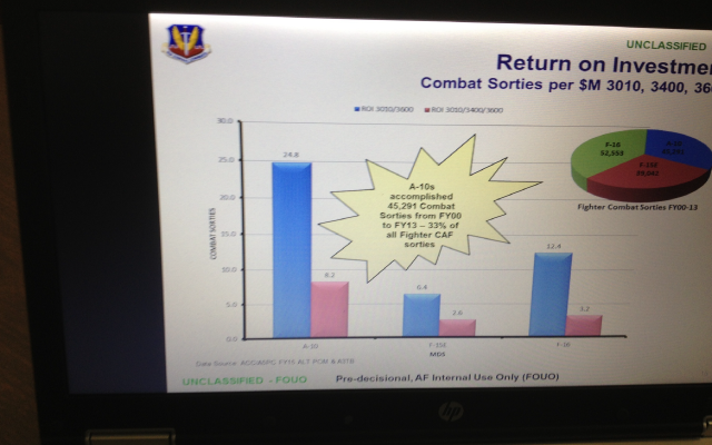 This slide, which was briefed by staffers within the USAF, tells a very different story than what the Generals are trying to sell. The slide verifies that the A-10 is cheapest by far to operate. Meaning taxpayers get more combat missions per mission dollars than any other USAF fighter aircraft.