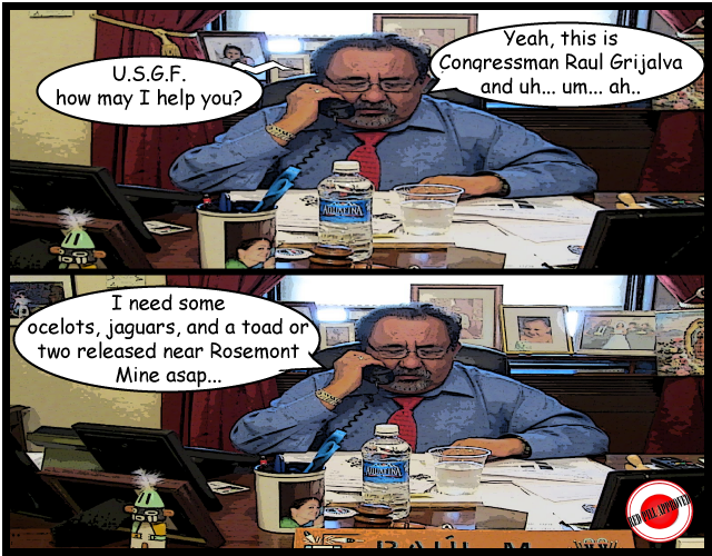 raul-girjalva-environmentalistRaul Grijalva has never seen a mineral project he has liked. This week, the Rosemont Mine located in Southern Arizona was dealt another blow when the federal government discovered that there are animals at the ready to stop the desperately needed jobs the mine would provide to the residents of the 8th poorest metropolitan area in the country. Lions, toads and ocelots… Oh My!