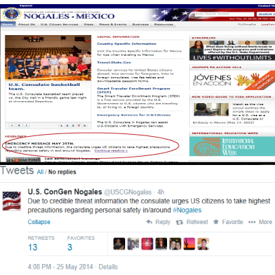 On Sunday, May 25, 2014, the U.S. Consul issued a warning to U.S. citizens “due to credible threat information.” The consulate urged US citizens to “take highest precautions regarding personal safety in and around Nogales.”