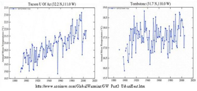 Much of our temperature record is warm-biased because of the Urban Heat Island effect (UHI). Concrete and asphalt in cities absorb heat and re-radiate it, especially at night. This makes cities warmer than surrounding rural areas. For instance, the chart below compares the temperature record of Tucson with that of Tombstone. Tucson shows a distinct warming trend while Tombstone shows no trend.