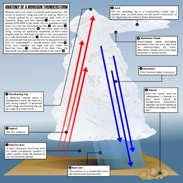 Monsoon thunderstorms have a particular anatomy as shown by the graphic below: