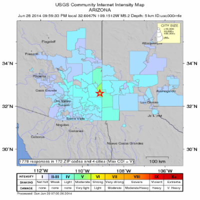 arizona-earthquakeAn earthquake measuring 5.2 occurred 09:59:33 p.m. The epicenter was located near Duncan, Arizona approximately at 50km northwest of Lordsburg, New Mexico.
